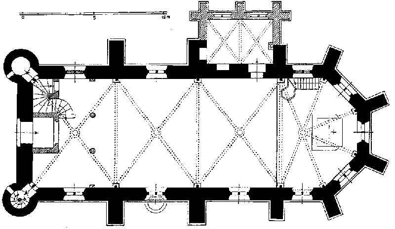 A l'extérieur, toute la construction est renforcée par des contreforts massifs. La façade est encadrée par deux tours cylindriques surmontées d'une coupole. Entre les deux tours, se trouve un portail de pierre et au dessus, une fenêtre à remplage. Au début du 14ème siècle, l'intérieur est couvert de peintures gothiques. Dans le mur sud, à la moitié de sa longueur, on peut voir l'ancien portail aujourd'hui muré.